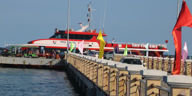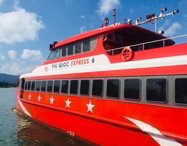 고속 보트는 약 1시간 30분 정도 걸리며, 이 노선은 캄보디아에서 오는 여행객들에게 특히 인기가 많습니다. 캄보디아 국경에서 택시를 잡아 페리 선착장까지 약 15만 동(베트남 동) 정도 지불하고, 거기서 푸꾸옥행 티켓을 구매하세요.